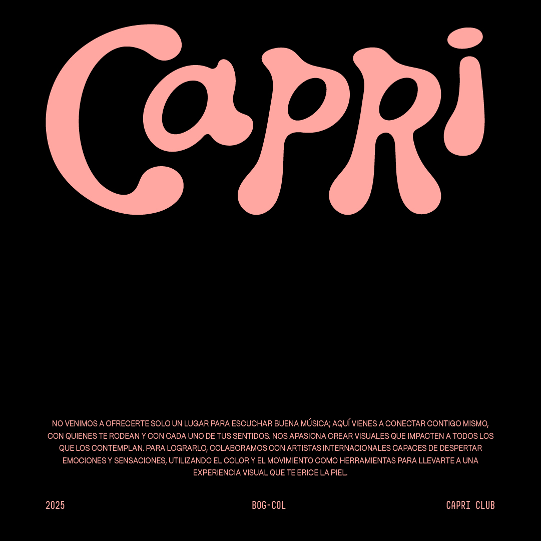 Capri es un club nocturno ubicado en la Zona T de Bogotá que busca redefinir la experiencia de la vida nocturna en la ciudad. Inspirado en años de curaduría musical y producción de festivales, el proyecto traslada esa energía a un espacio donde música, visuales y arquitectura se integran en una experiencia sensorial. Diseñamos una identidad vibrante que dialoga entre la electrónica y el reggaetón, con un logotipo creado a medida y un sistema visual construido alrededor del círculo —inspirado en la pantalla central del club, conocida como el portal— símbolo de acceso a otra dimensión de sonido y luz.