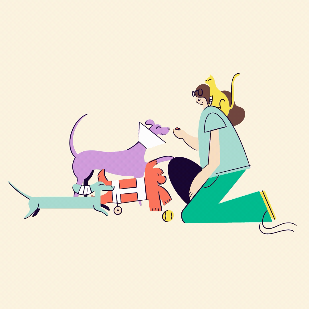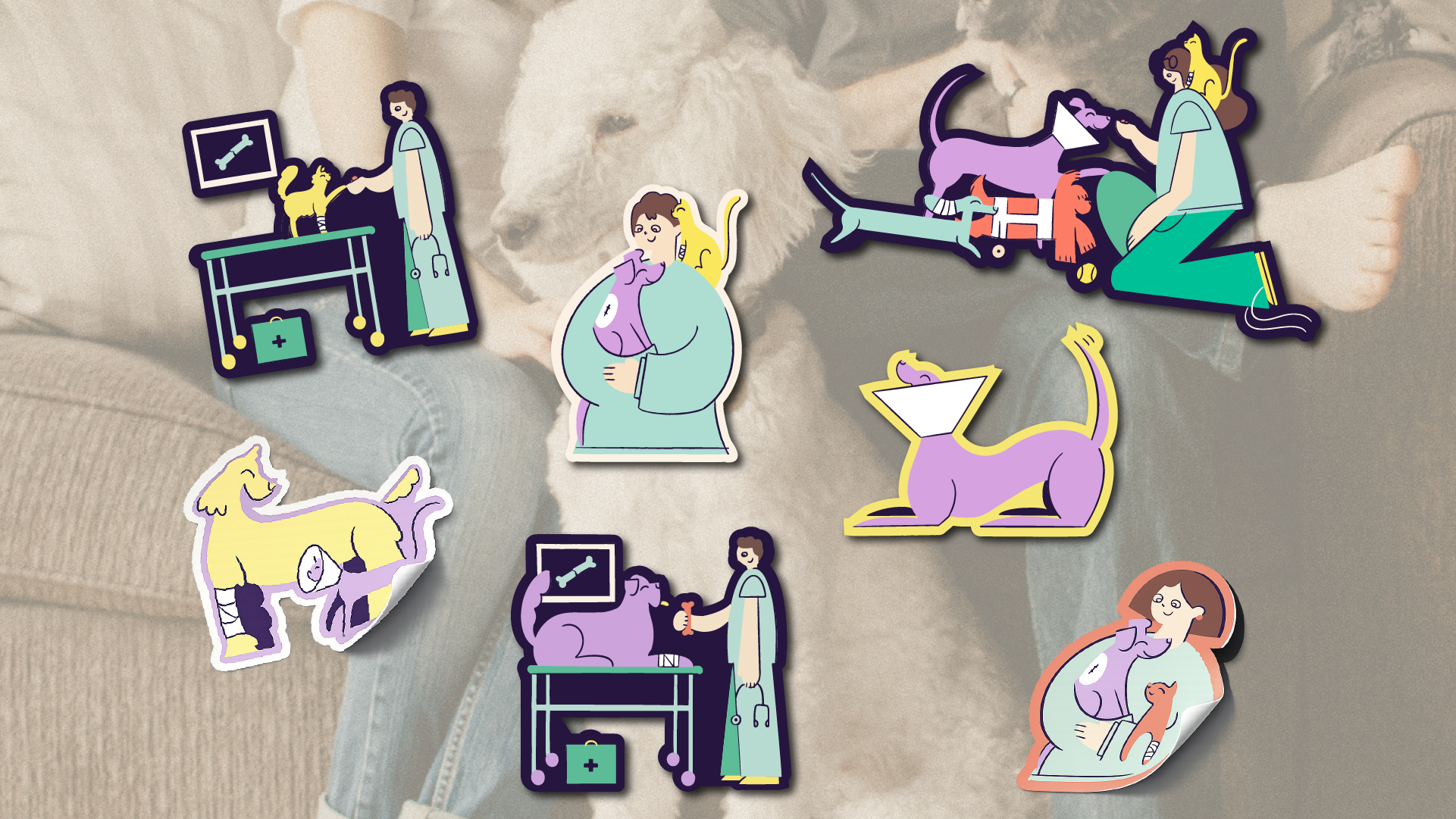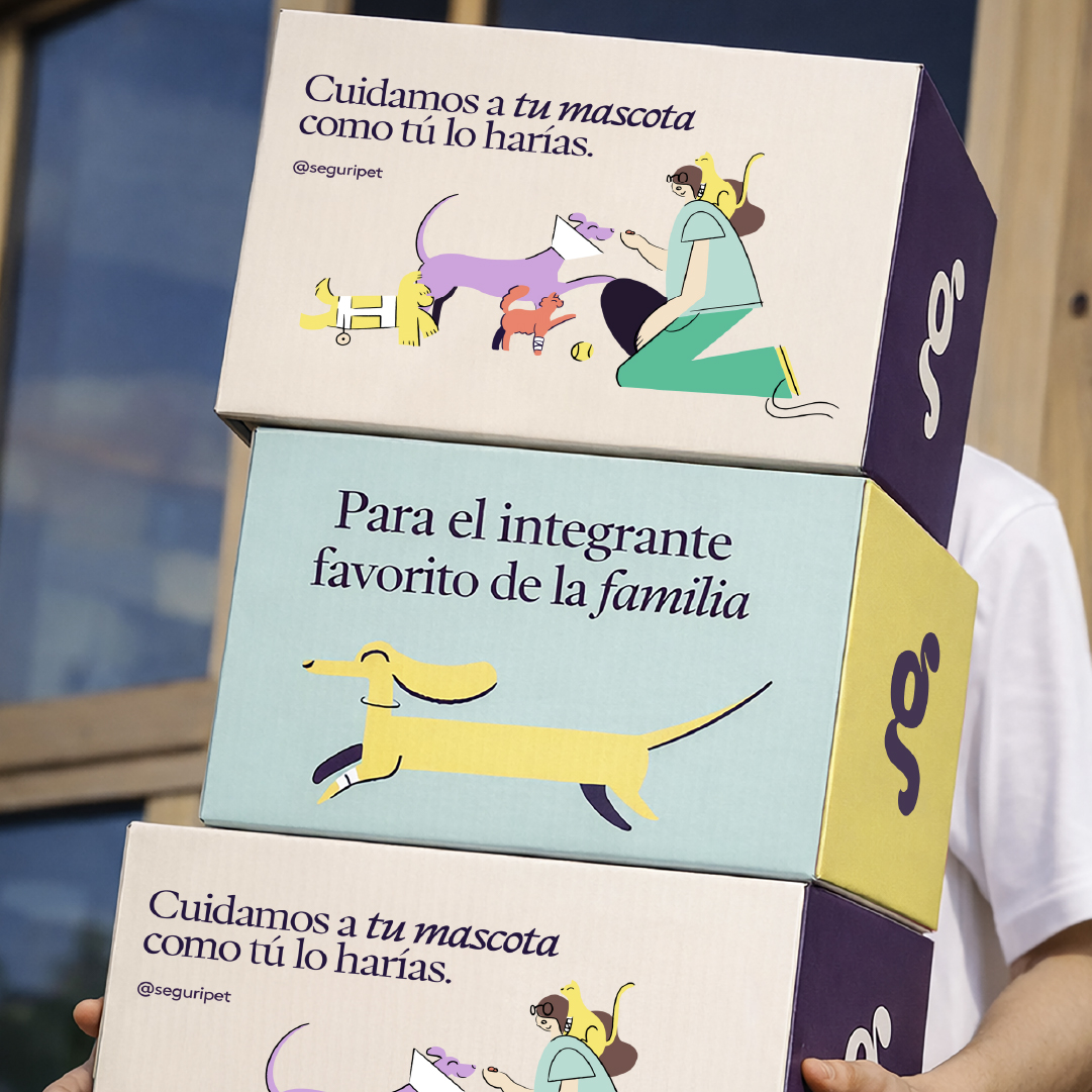 El lenguaje visual se complementa con una serie de ilustraciones modernas y juguetonas que muestran perros y gatos felices después de haber pasado por cuidados veterinarios. Este universo gráfico se integra con fotografía intervenida, creando una identidad cálida que transmite seguridad, cuidado y alegría.