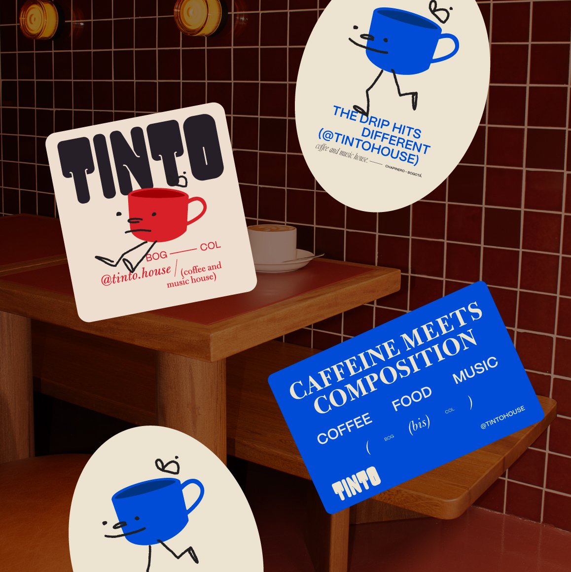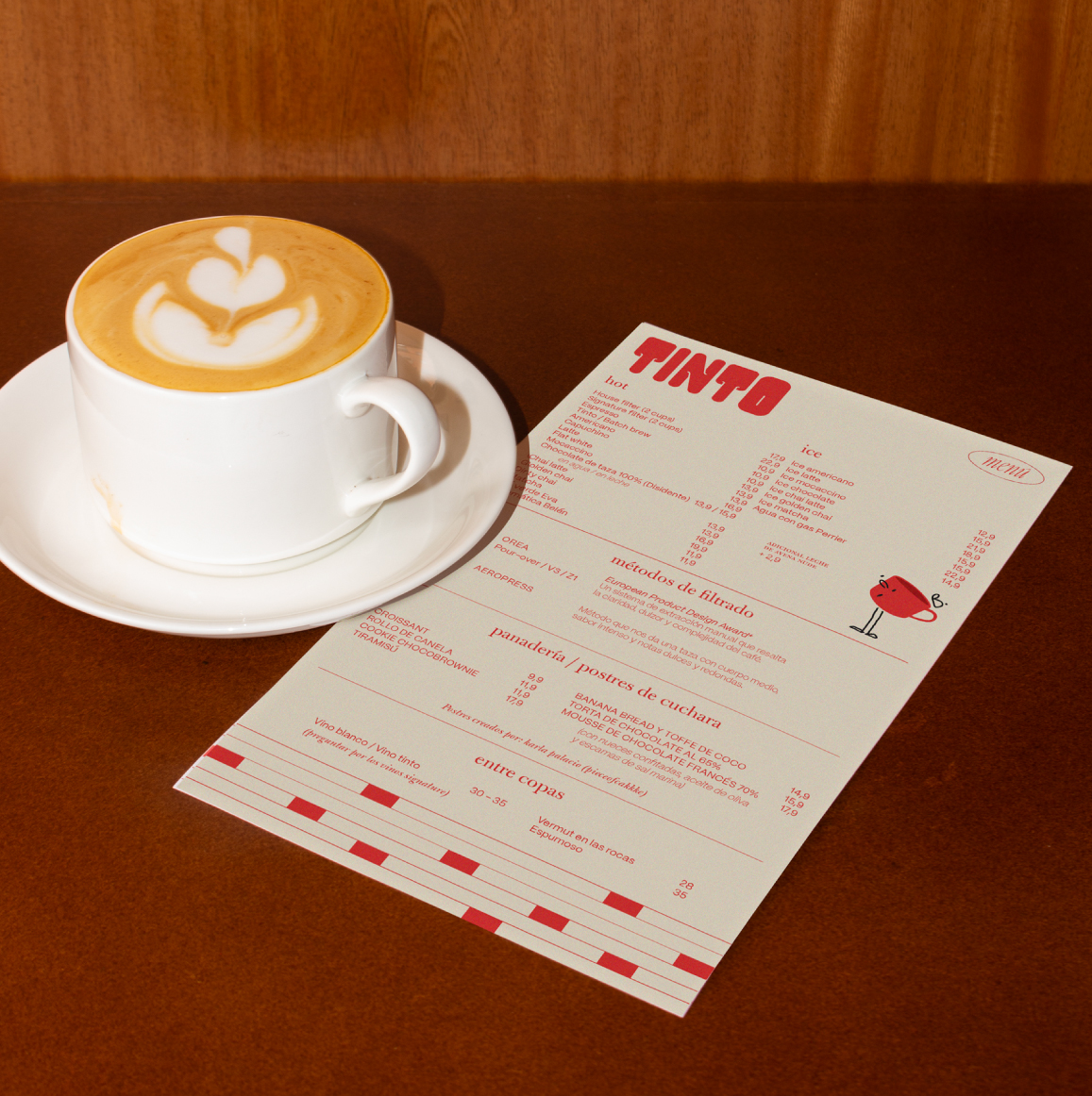 Tinto llegó a nosotros con un logo y una paleta de color definidos, pero sin un sistema de identidad que le diera coherencia a todos sus puntos de contacto. A partir de los atributos de la marca y de la arquitectura del lugar, donde predominan el enchape color vino tinto y la iluminación cálida, desarrollamos una serie de elementos gráficos que construyen una personalidad vanguardista, acogedora y cool. Partimos de un gesto simple pero memorable: una taza de tinto con expresiones amigables que se convierte en un personaje capaz de representar el espíritu cercano de la marca. A partir de ahí, diseñamos un sistema de identidad basado en una reinterpretación de la gráfica los manteles de restaurantes, que aporta un carácter clásico y cálido, y que dialoga con una diagramación más contemporánea y con el logo funky que ya hacía parte del universo visual. También desarrollamos una serie de copies que comunican la propuesta de valor de Tinto: un lugar donde cada detalle está cuidadosamente curado, desde la música, los acabados y la iluminación, hasta lo más importante: servir el mejor café de especialidad de la ciudad.